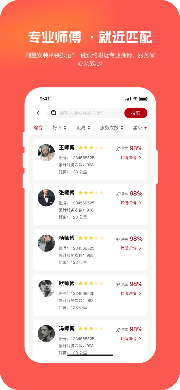 2、在搜索页面,你能够迅速找到所需师傅,并实时高效地完成预约操作。
