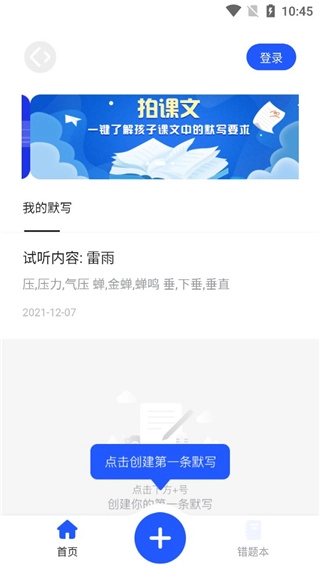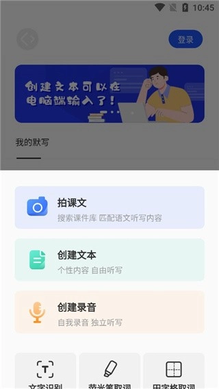 1、可自主创建录音支持听写,与拍课文、创建文本等方法创建的内容一并记入首页听写记录