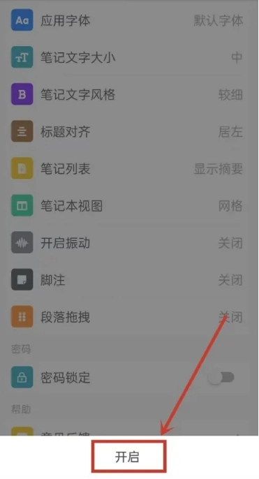 3、进入脚注设置页面,点击“开启”,便能开启脚注功能。