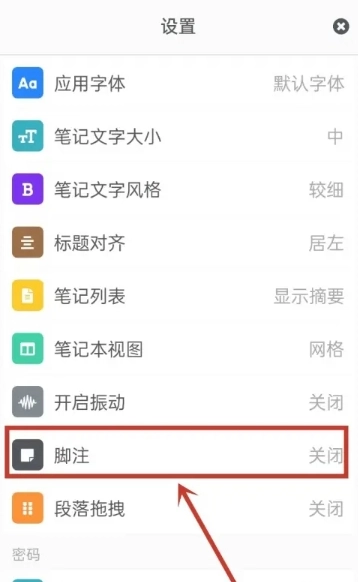 2、进入设置页面,点击【脚注】