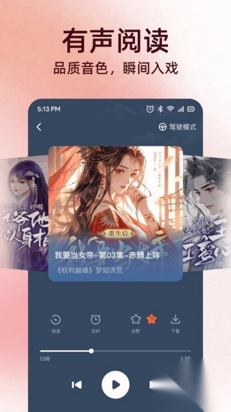 3、专业配音及音色挑选:聘请资深配音演员为热门书籍打造高质量有声版本,同时提供丰富的音色选项,像萝莉音、御姐音,还有温暖治愈的男中音。