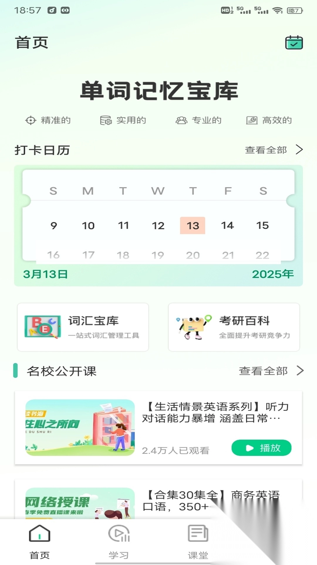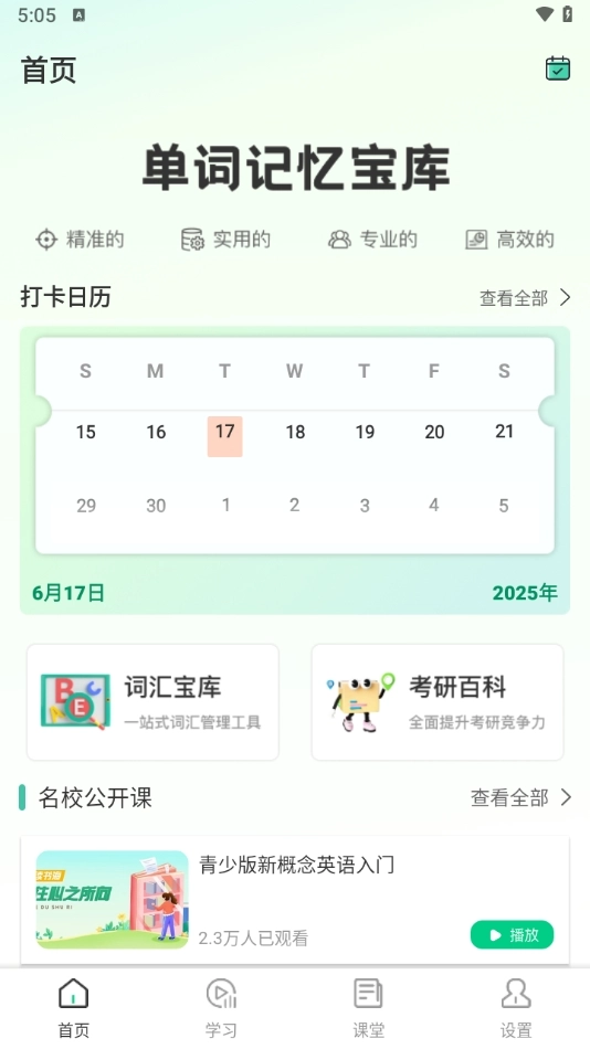 1. 首页呈现的是分类明晰的功能模块,包含课程学习、词汇积累、听说训练、阅读写作、能力测评等多个领域。用户能够依据自身需求与学习目标,自主选择进入对应的板块开展学习。
