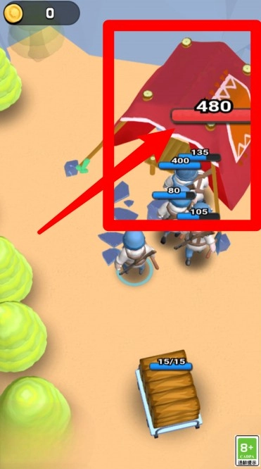 1.建筑攻击目标明确:红色帐篷为敌方据点,目前耐久值为480。派出部队靠近可自动进行攻击,直至建筑被摧毁。