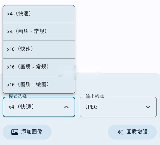 可支持多种图片格式进行输入与输出,同时能够自由选定放大倍数以及输出质量。