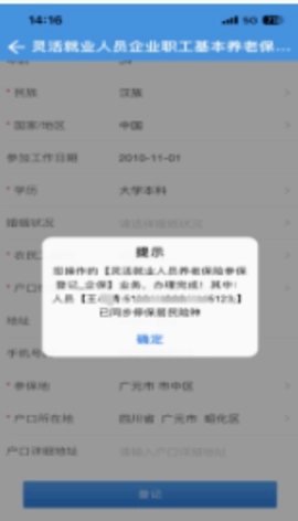 2. 轻点“灵活就业人员企业职工基本养老保险参保登记”,进入相应界面后,逐一完善民族、学历、手机号码、户口性质等相关信息,接着挑选参保地,最后点击“登记”,如此便可成功完成办理。
