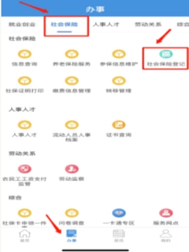 1. 点开“办事”,从中寻得“社会保险”,接着点击其右上方的“社会保险登记”