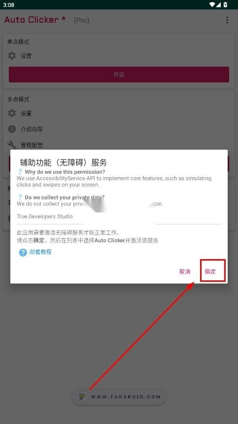 首先,打开应用程序(app),此时会弹出辅助功能无障碍服务的相关提示,点击“确定”选项,从而开通无障碍权限。