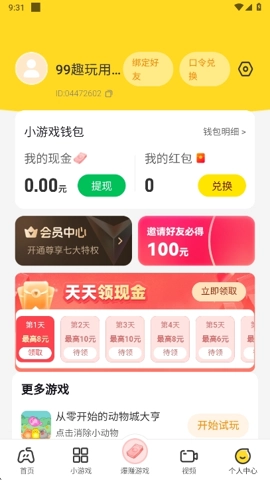3、仅需轻点个人中心,选中提现功能,99趣玩就能把赚到的红包便捷地提取至自己账户。