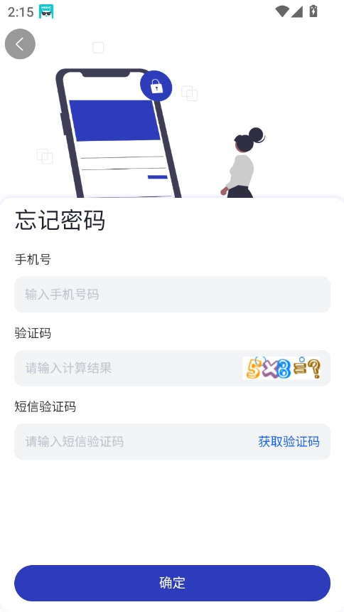 2. 填入手机号、验证码以及短信验证码,点击“确定”,即可完成密码重置。