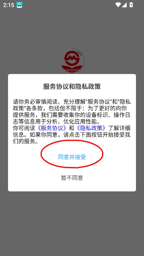 1. 下载并安装申通地铁智学学员端,点击“同意并接受”后进入。