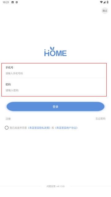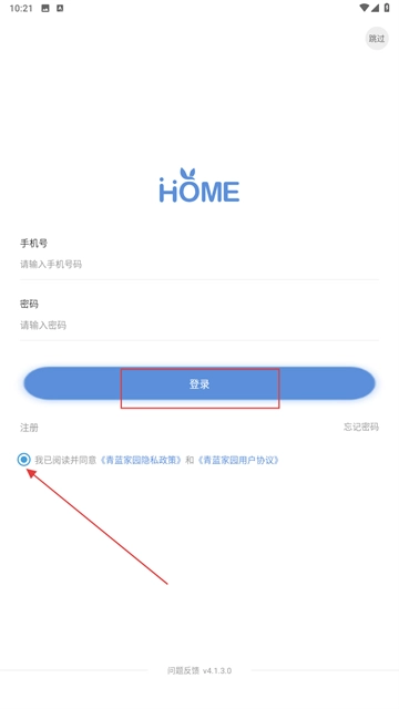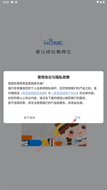 1、在协议弹窗点击【同意】,进入青蓝家园家长端登录流程。