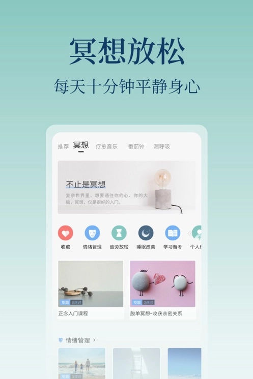 合东西方前沿冥想技巧和研究成果,并大胆进行革新,开发出适宜国人练习的冥想课程。每天10分钟,从新找回更好身心状态。