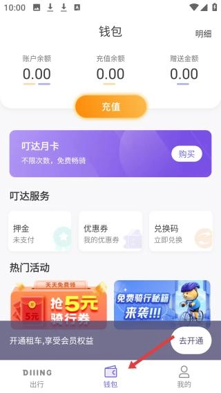 2. 点击后,钱包余额信息一目了然,不仅支持充值,还提供月卡购买等服务,同时展示热门活动,全方位满足账户资金管理需求。