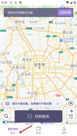 1. 点击“出行”后会呈现地图,此时提示租车功能尚未开通。页面设有扫码租车等功能,购卡优惠信息十分醒目,便于出行相关操作。