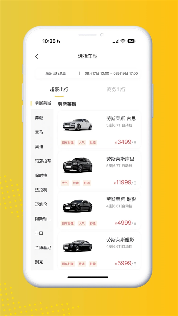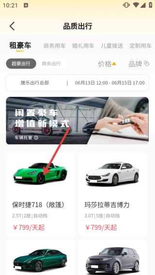 2、进入品质出行页面,选择心仪车型,查看车辆详情。