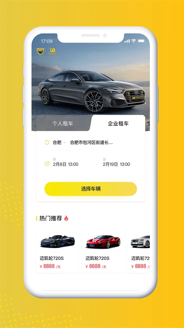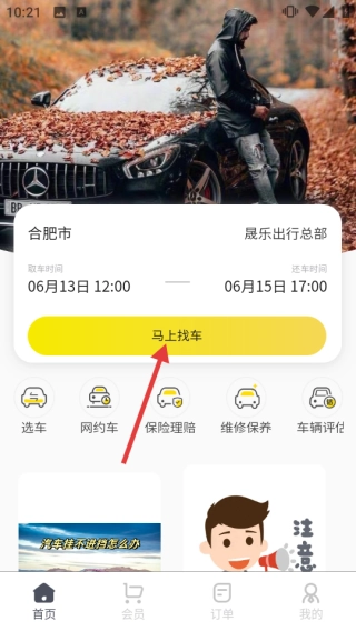 1. 于首页确定取车与还车的时间及地点,然后点击【马上找车】。