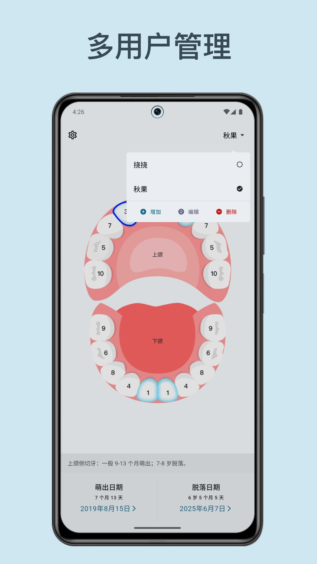 4、多宝同步管理:可添加多个宝宝档案,针对每个宝宝分别记录其牙齿发育状况,充分满足多孩家庭在育儿过程中个性化跟踪的需求。
