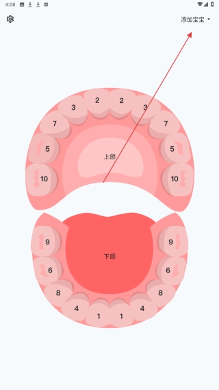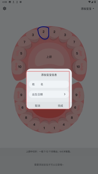 1、点击页面右上角【添加宝宝】,进入添加宝宝信息流程,用于记录宝宝口腔牙齿数据。