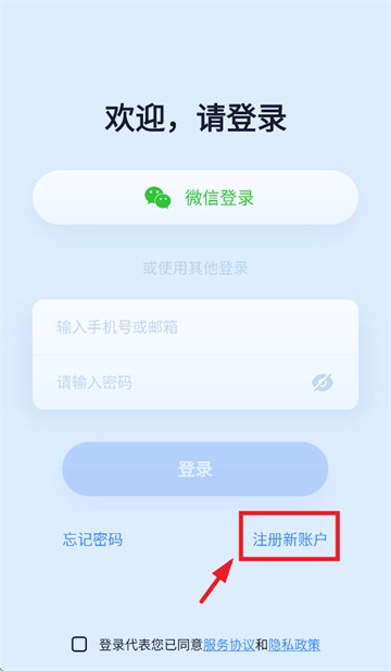 首先下载并安装wosee摄像头app,安装完成后打开该应用。待进入登录界面,在此界面中选择注册新账户这一选项。