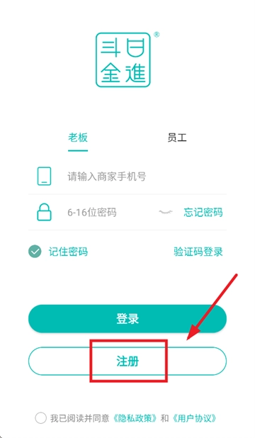 先下载并安装日进斗金服装软件,安装完成后打开该软件。待软件打开,进入登录界面,此时点击界面上的注册按钮。