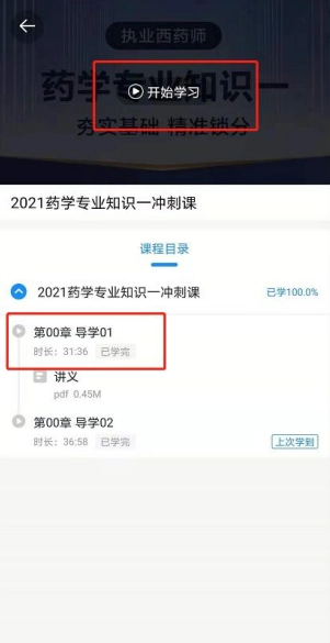 2. 在页面上挑选出想要查看的课程,随后进入该课程的详情页面,进而开始课程播放。你既能够点击【开始学习】按钮,也可以在课程目录里选中某一课程,以此进入课程学习环节。具体操作如以下图示: