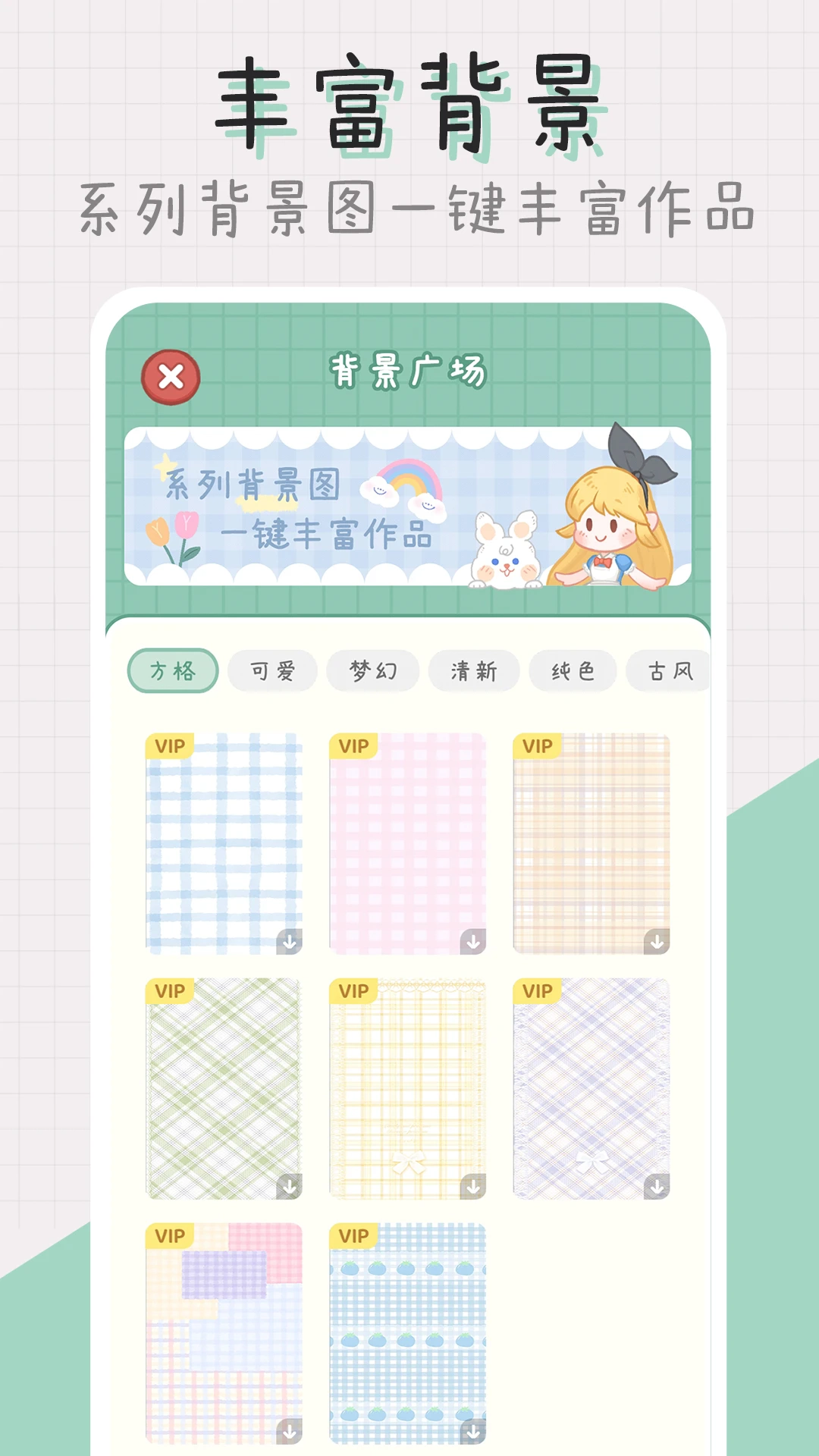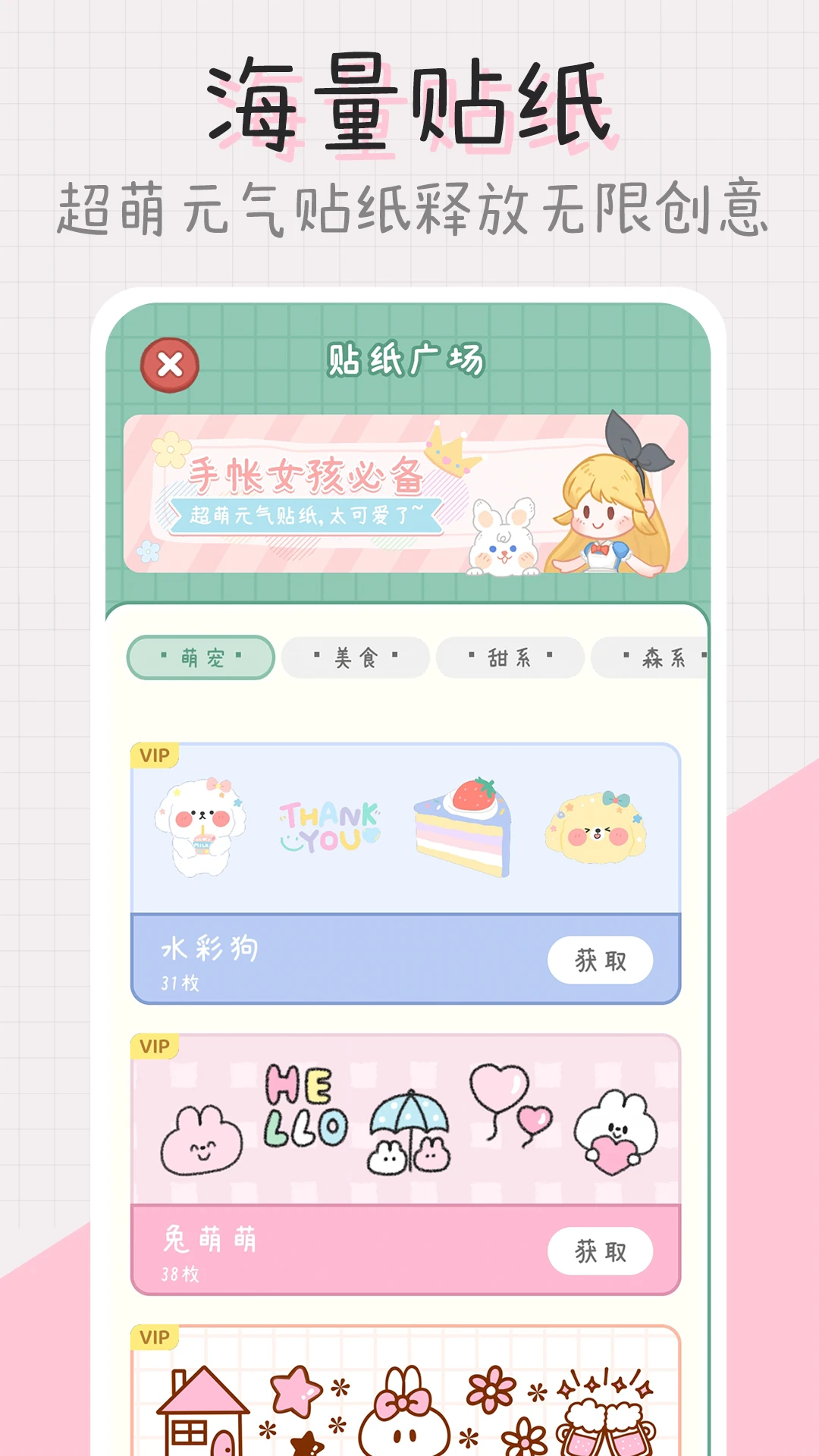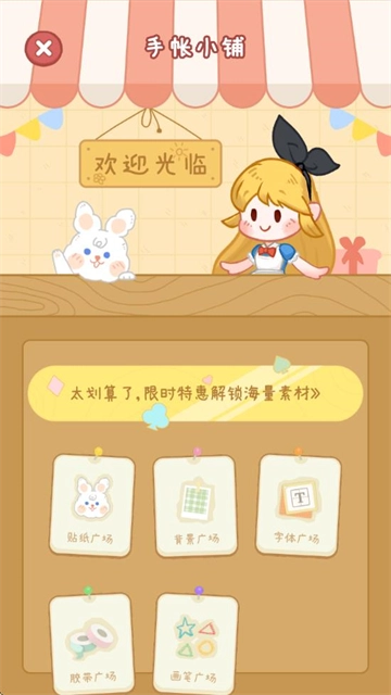 3、在此处能够购买素材,这里有各类可爱的贴纸、便签以及背景图。