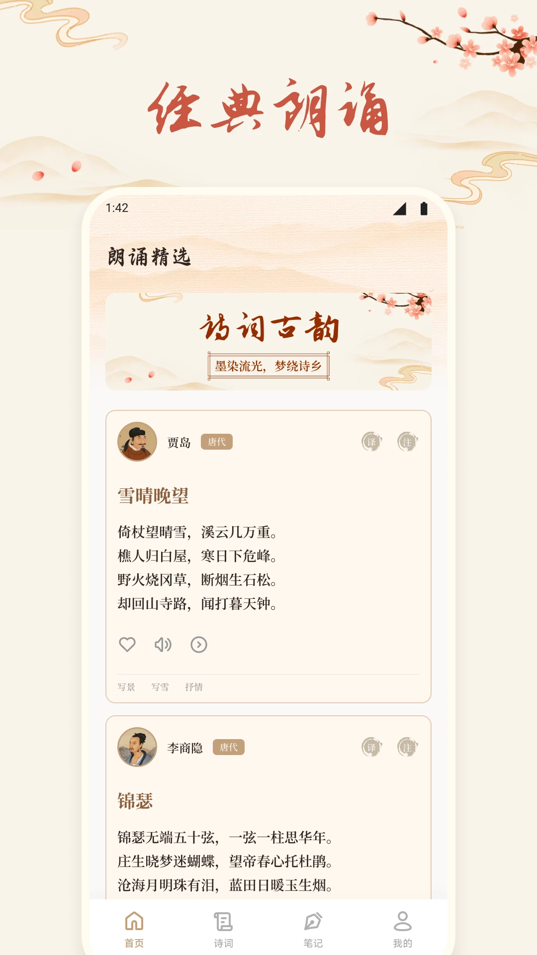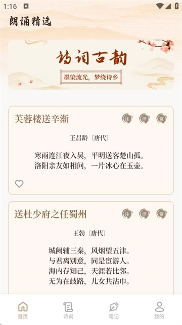 2、专业朗诵团队深情发声,每首诗词皆配备标准朗读音频,以字正腔圆的精彩演绎,让文字仿佛在耳畔鲜活起来,助力用户领略古典诗词的音韵之美。