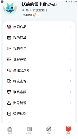 5、在“我的”(即个人中心)中,涵盖学习作品创建、课程管理,以及我的订单、我的券包、课程兑换等优惠福利。若在使用过程中遇到任何问题,也能在此联系客服。