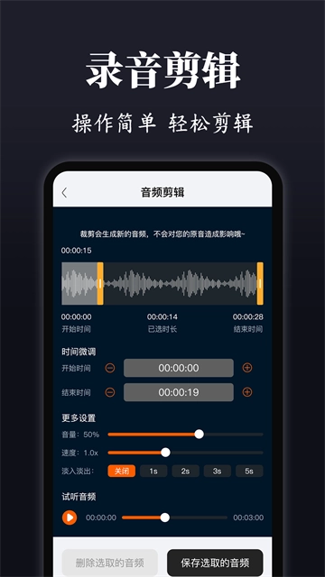3、自由剪辑:配备操作简便的音频剪辑工具,可自由裁剪音频片段。