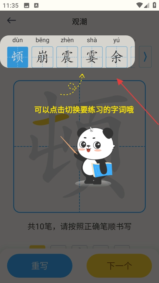 2. 于练字页点击上方的字词,便能切换正在练习的字词。