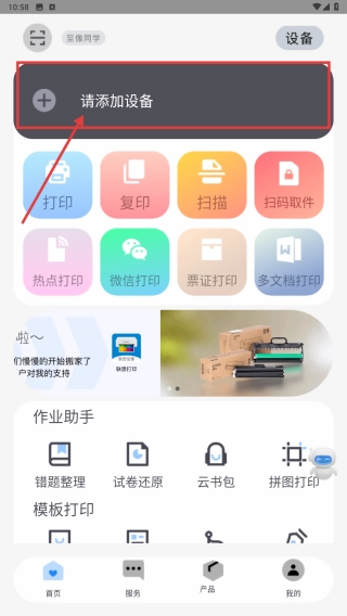 1. 开启打印,点击“请添加设备”按钮,进入添加打印机功能界面。