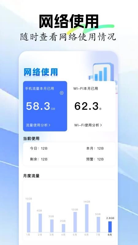 提供精准详尽的流量数据,将手机流量与WiFi数据分开呈现,让您能更便捷地了解上网流量情况。