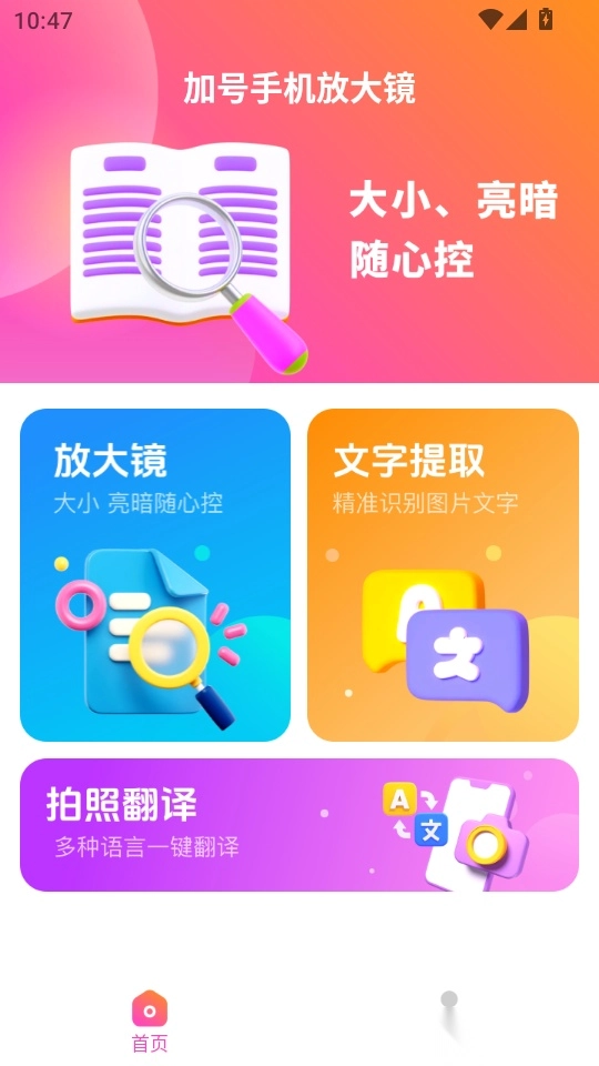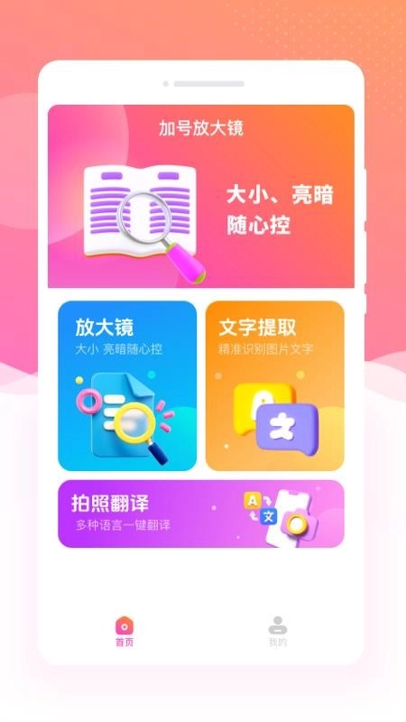加号手机放大镜是一款具备实用手机放大镜功能,以及文字拍照翻译服务的应用软件。只需打开相机或导入照片,就能轻松完成放大与文字翻译操作。而且,该软件还配备了出色的文字识别提取工具,可精准提取图片中的文字。