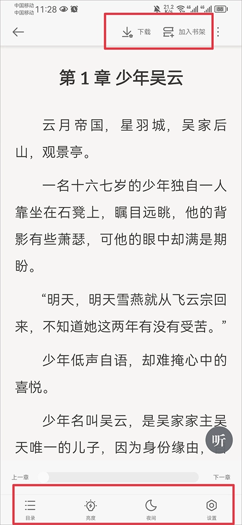2、选中小说后点击即可开启阅读,点击屏幕能够呼出菜单,用户在此菜单中,既可以将小说加入书架,也能够查看目录、调节亮度,还能进行更多设置等。