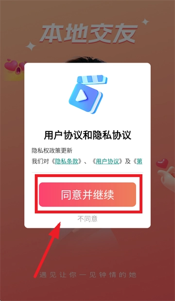 先安装橙色媛聊,安装完成后打开该应用。当出现用户协议和隐私协议提示界面时,点击“同意并继续”选项。