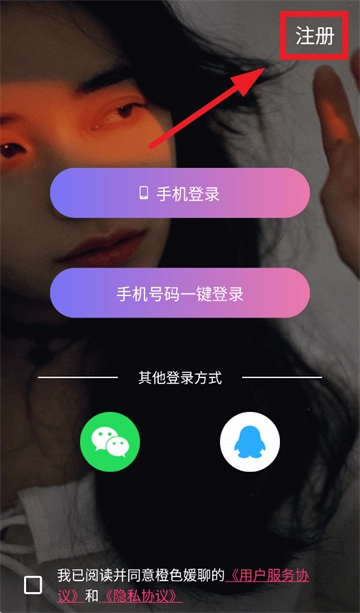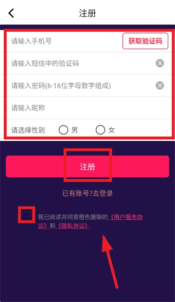 在注册页面,依次输入手机号、短信验证码、密码以及昵称,接着选择性别,勾选“我已阅读并同意橙色媛聊的《用户服务协议》和《隐私协议》”,最后点击“注册”按钮,就能完成注册。