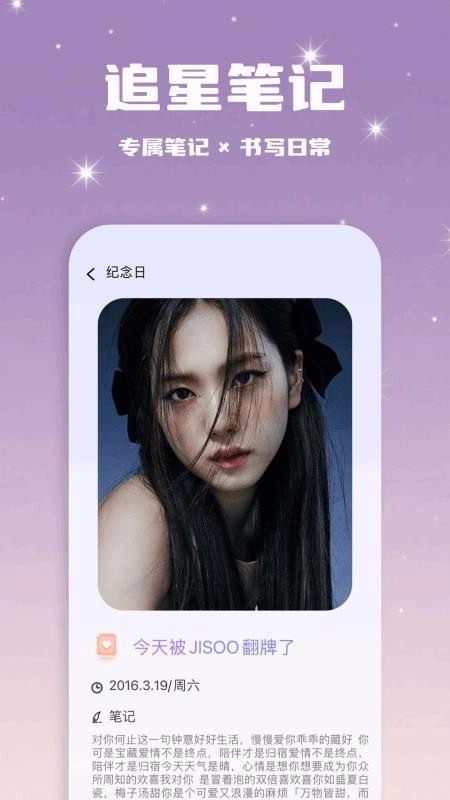 为用户打造线上专属追星笔记,用户能够通过它进行记事本式的记录,轻松记录追星生活中的点点滴滴。