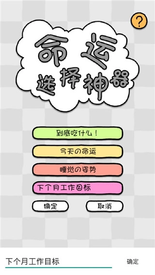命运选择神器,专为选择困难症患者量身打造,助您轻松摆脱选择困境。软件内设有多种预设选项转盘,诸如“今天吃什么”“今日运势”“睡觉姿势”等,用户只需轻轻一转,就能随机获取应选的选项。倘若预设选项无法满足需求,您还能自行新建转盘,针对那些令您犹豫不决的选项进行随机抉择,说不定这就是命中注定的选择呢!这款软件采用轻量化设计,内存占用极小,操作简单便捷。要是您渴望快速解决眼前棘手的选择难题,那就赶紧试试命运选择神器吧!