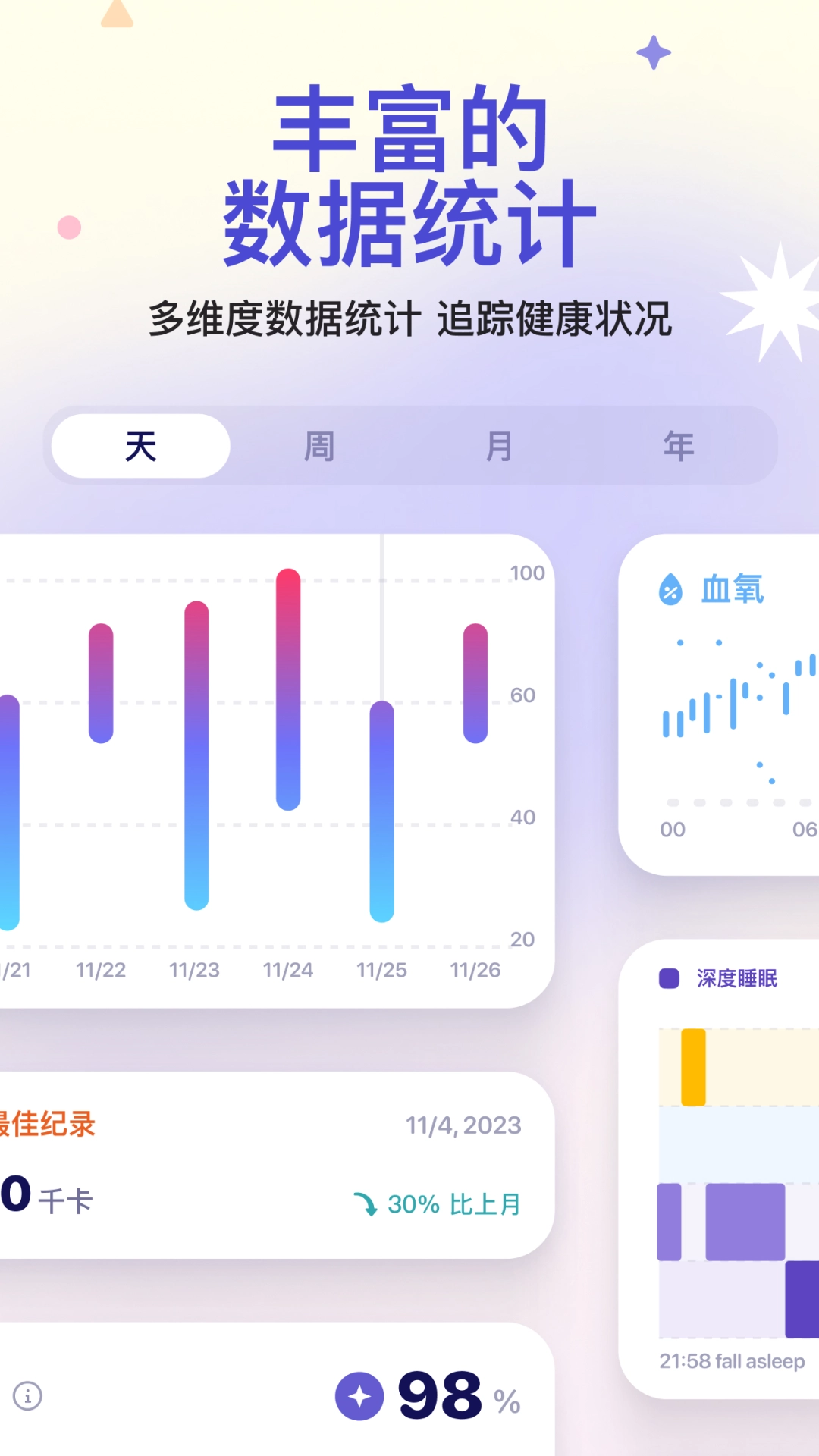 3、通过日、周、月及年的健康数据分析,用户能够清楚地了解自身的健康趋势。
