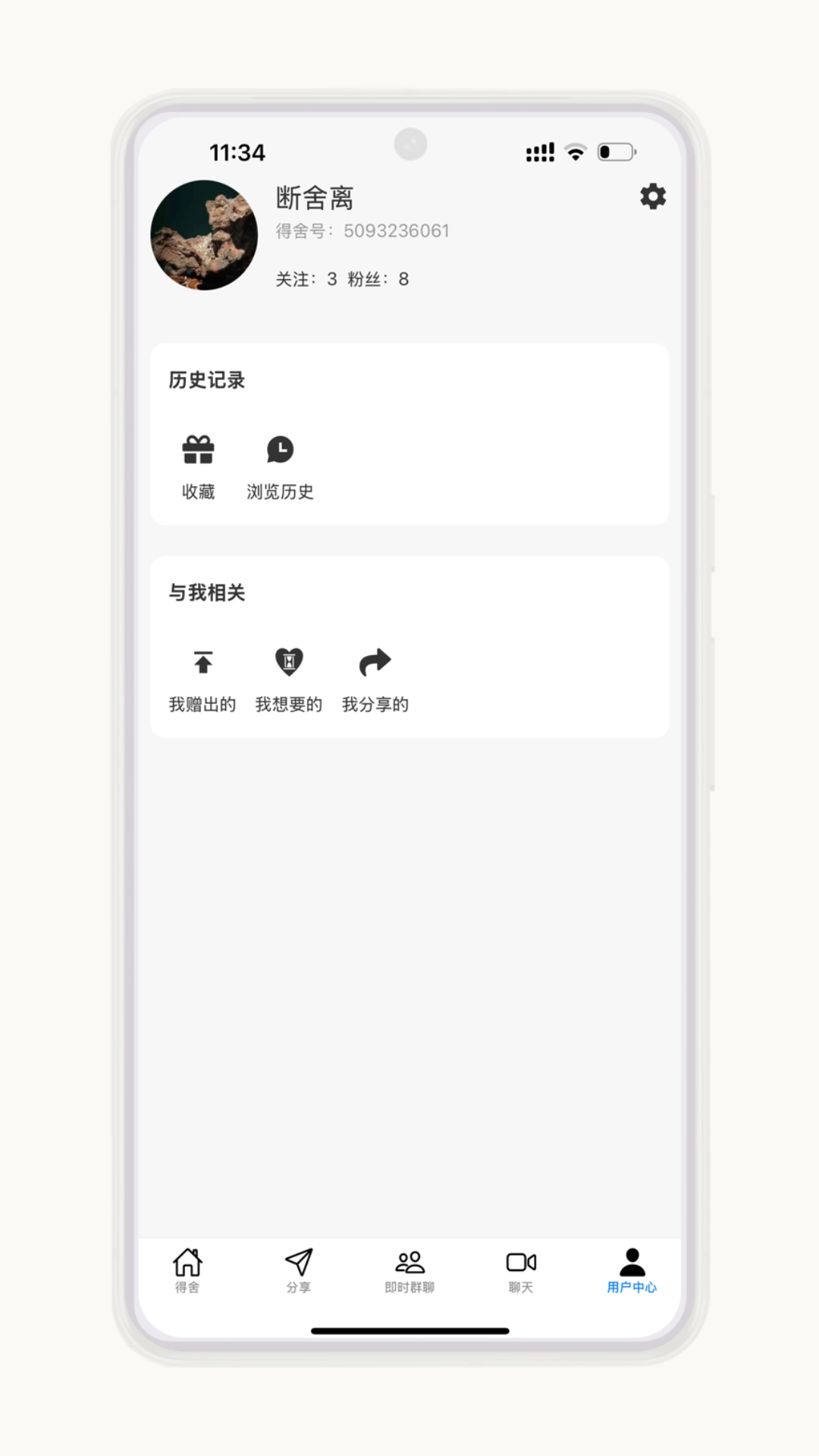 接着打开得舍,完成注册、登录以及认证,就能在线交换闲置物品。