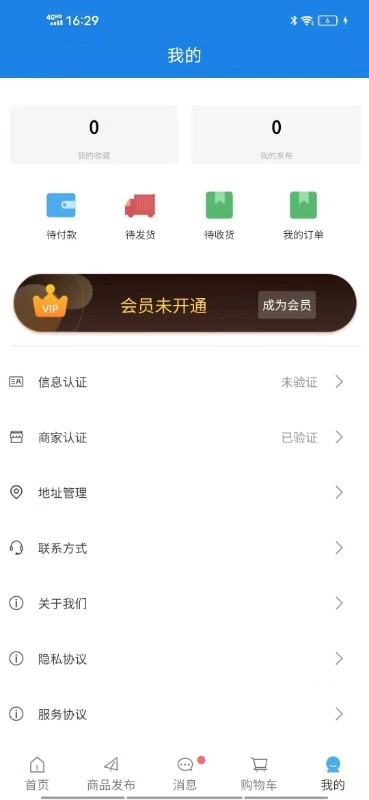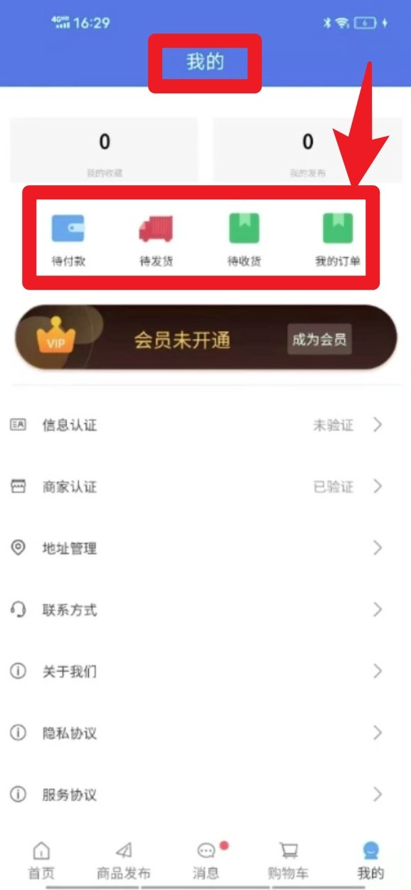 4. 进入「我的」页面,你能够管理待付款、订单以及收货发货状态,还能完成商家认证与地址设置。