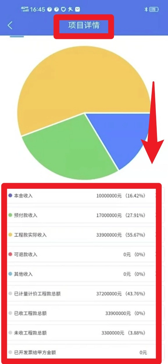 2. 于「项目详情」页面查看各类收入构成明细,涵盖本金、预付款、工程款以及未收款金额等。