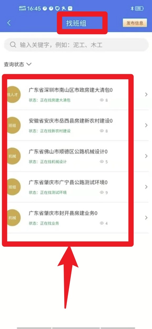 3. 如果有招聘人员或寻找班组的需求,可点击选择「找班组」模块,查看当前已发布的需求,也能快速发布找人信息。