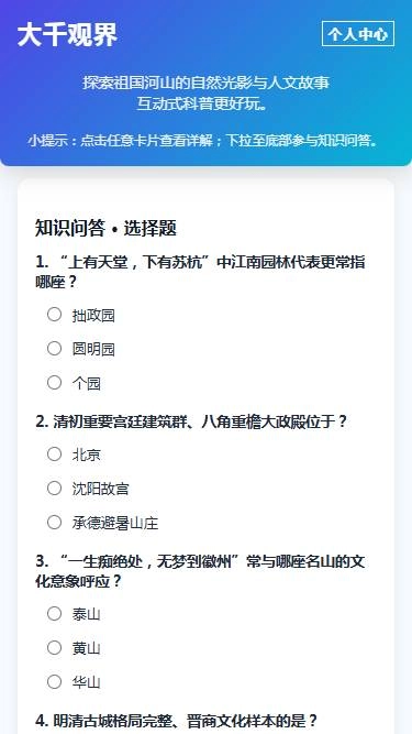 大千观界是一款极为实用的学习科普类软件。它涵盖了丰富多元的地标建筑与景点,像长城、故宫、泰山等皆在其中。用户能够随时自由挑选,借此学习各类知识。软件还推出了全新的科普形式,用户可直接查看图片与景点介绍,从而轻松了解各类文化。它完全能够满足用户所有的学习需求,而且会实时更新各类知识问题,助力用户轻松掌握各种知识以及人文内容,为用户营造全面的学习氛围,带来学习乐趣。此外,该软件具备简单易上手的功能,能随时随地在线记录用户的错题,方便用户下次继续学习。