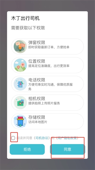1. 第一步,点击开启木丁出行司机应用。当权限请求弹窗出现时,仔细检查位置、电话、相机、存储等权限均准确无误后,勾选同意司机协议与隐私政策,接着点击“同意”按钮继续操作。