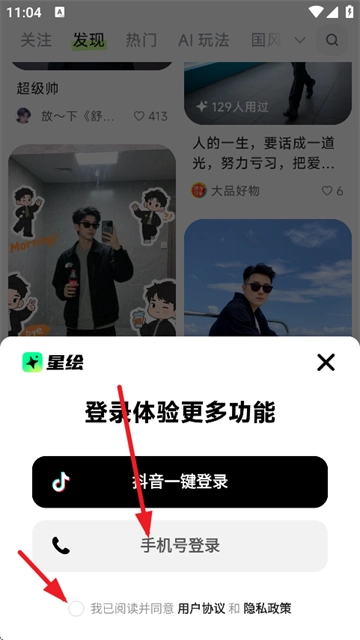 2、登录方式有手机号与抖音号两种,我们选取手机号登录。注意要勾选用户协议及隐私政策。