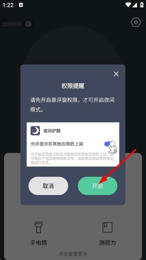 2. 在权限提醒弹出的窗口中,点击“开启”选项,通过开启悬浮窗权限来启用夜间模式。