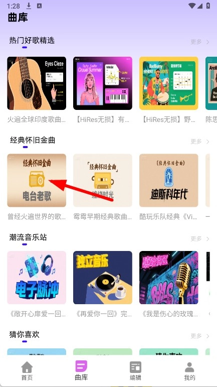 2. 在曲库页面的经典怀旧金曲板块里,点击电台老歌。