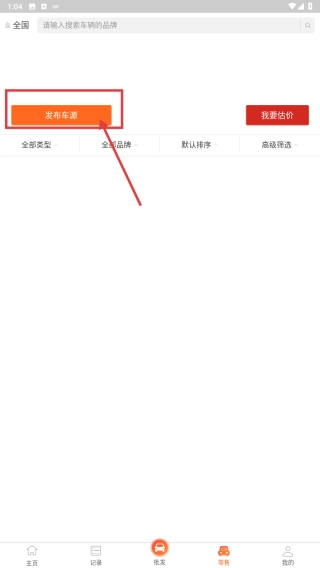 2. 在零售页面当中,点击“发布车源”按钮,随即进入登录界面。