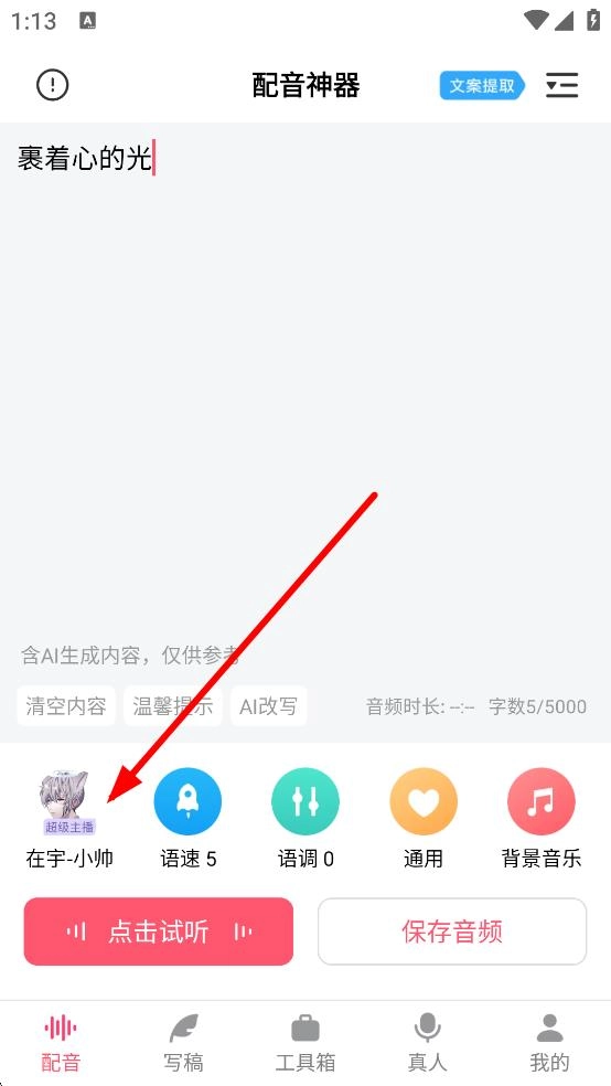 1、来到配音页面,输入需配音的文本,接着点击主播头像,即可进入主播选择页面。